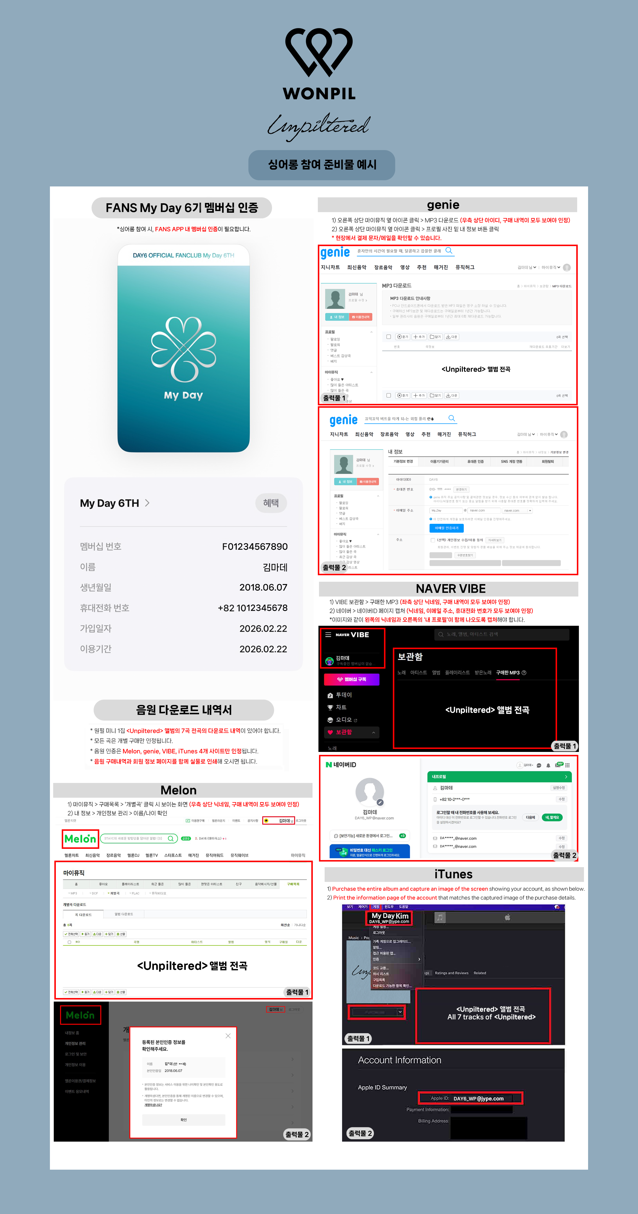 * 음원 다운로드 내역서의 경우, 원필 <Unpiltered>에 수록된 7곡 개별 구매 (다운로드 상품권으로 다운로드 X, 개별 결제 O)인지 알 수 있도록 개인 정보 페이지와 함께 프린트물로 “출력”해 오셔야 인정됩니다.