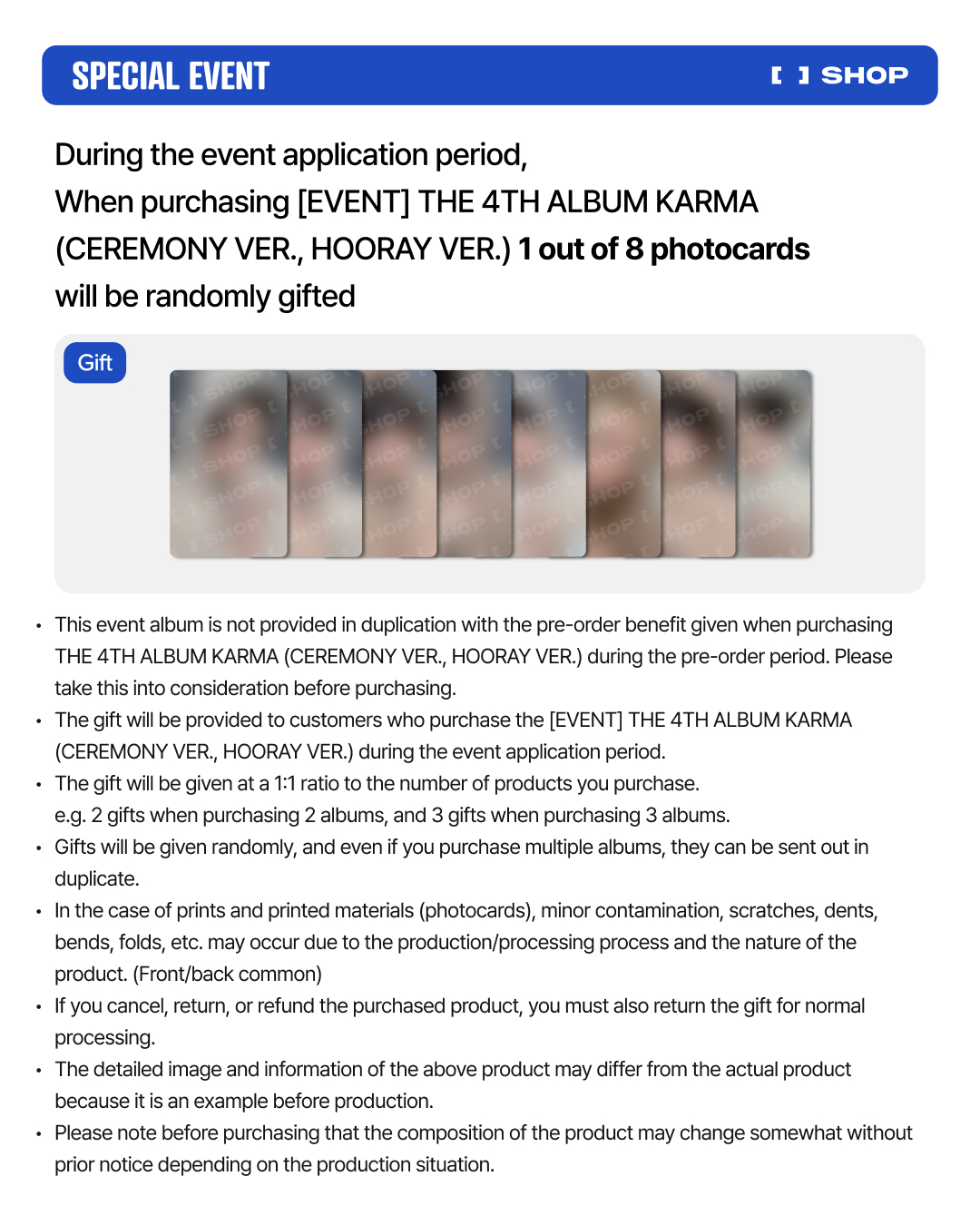 - For printed materials and photo-related products (e.g., photocards), minor smudges, scratches, dents, bends, or creases may occur due to the nature of the product and the manufacturing and production process.